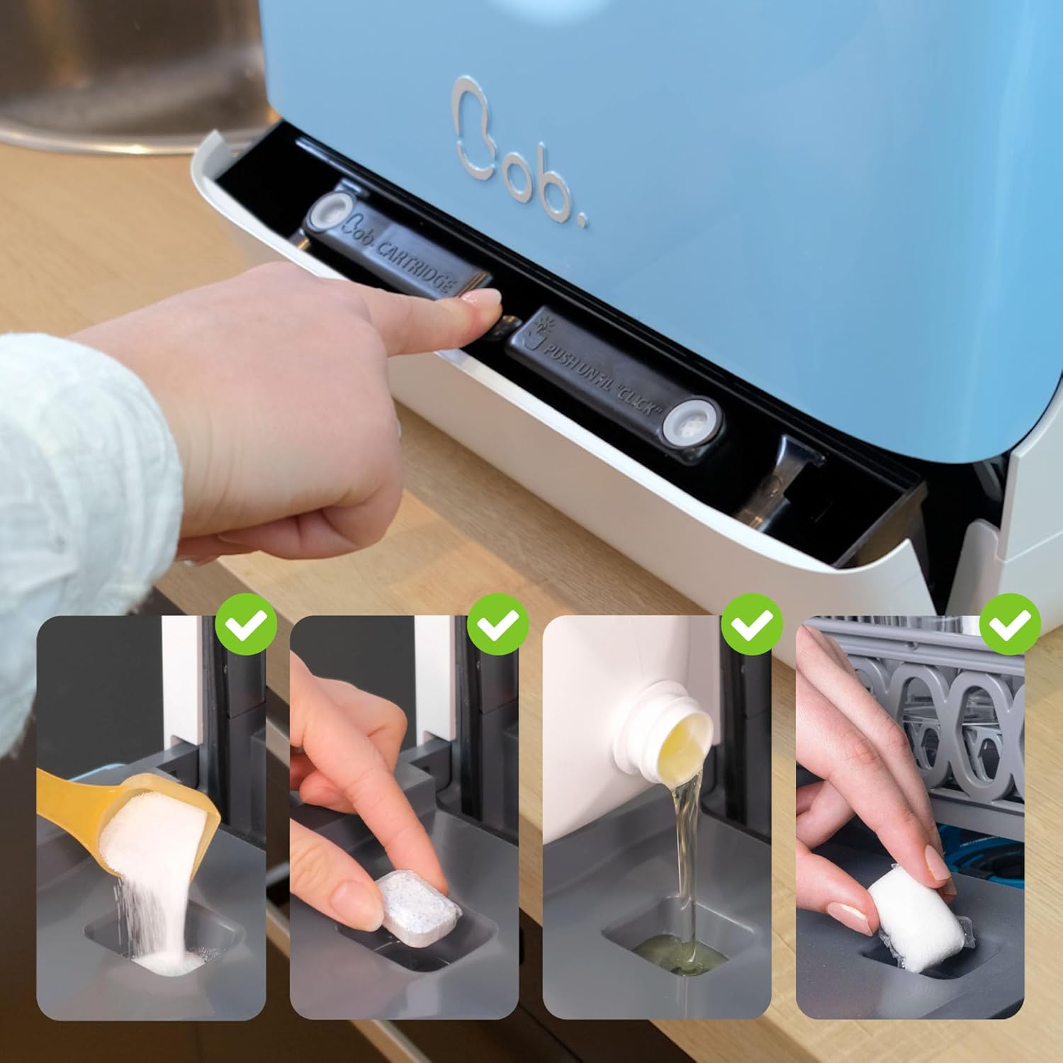 - APPLICATION: Charge your dishes, pour the water into the tank (if it is not connected to a water supply), add the detergent (Bob Cassette/Tablet Bob or any other detergent on the market) and then start the program you want (Beautiful LCD Color Screen). Once the bike is complete, your Bob will automatically open to allow a natural and quick air-dry of your dishes.