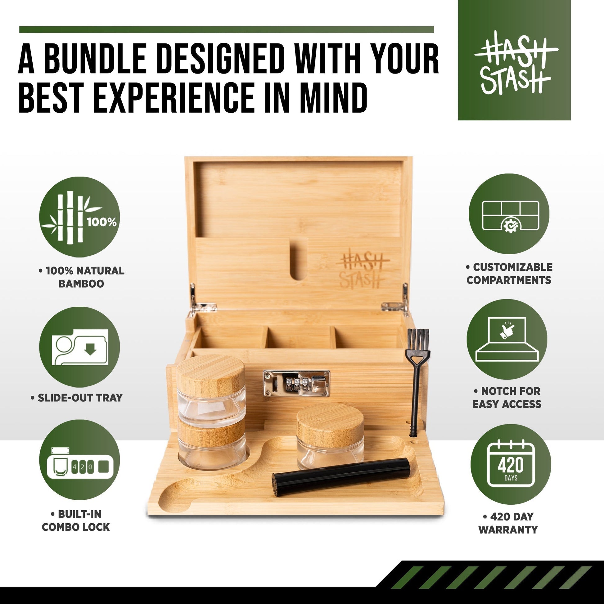 Don’t stress! We hooked you up with some high-quality accessories to use right out of the box. A rolling tray. 3 gorgeous bamboo-finished glass jars. A storage tube. Even a cleaning brush. (Grinder sold separately)